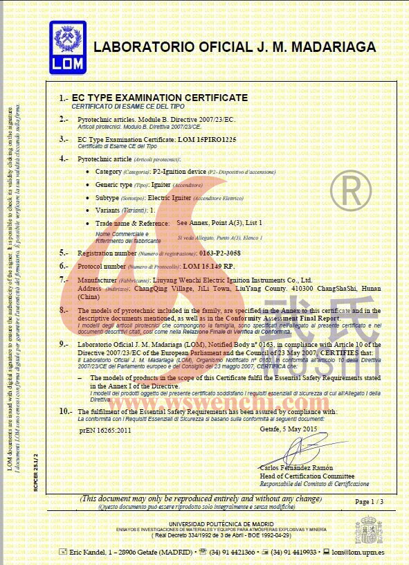 瀏陽市文馳電點火具有限公司(原培文電子點火器材廠),創建于1998年,是一家專業從事研制銷售電子點火產品的民營科技企業,是我國第1枚煙花用電點火頭生產者,是《煙花爆竹電點火頭國標》牽頭起草單位。公司位于中國“煙花之鄉”湖南省瀏陽市,地理位置優越,交通便利。    我公司研制的對象是用電能引燃火藥、做機械功等預定功能的一次性使用的元件或裝置,包括電點火頭(英文名ElectricMatch or Electric Igniter,中文俗稱“電火柴”或“電發火頭”)、電點火管和延期電點火管;我們估且在以后的產品技術欄中將我們研究的產品統稱為電點火具,將電點火器看成是用于提供和控制供給電點火元件點火的電能器材;我們研究的電點火橋路有橋絲式、無橋絲···